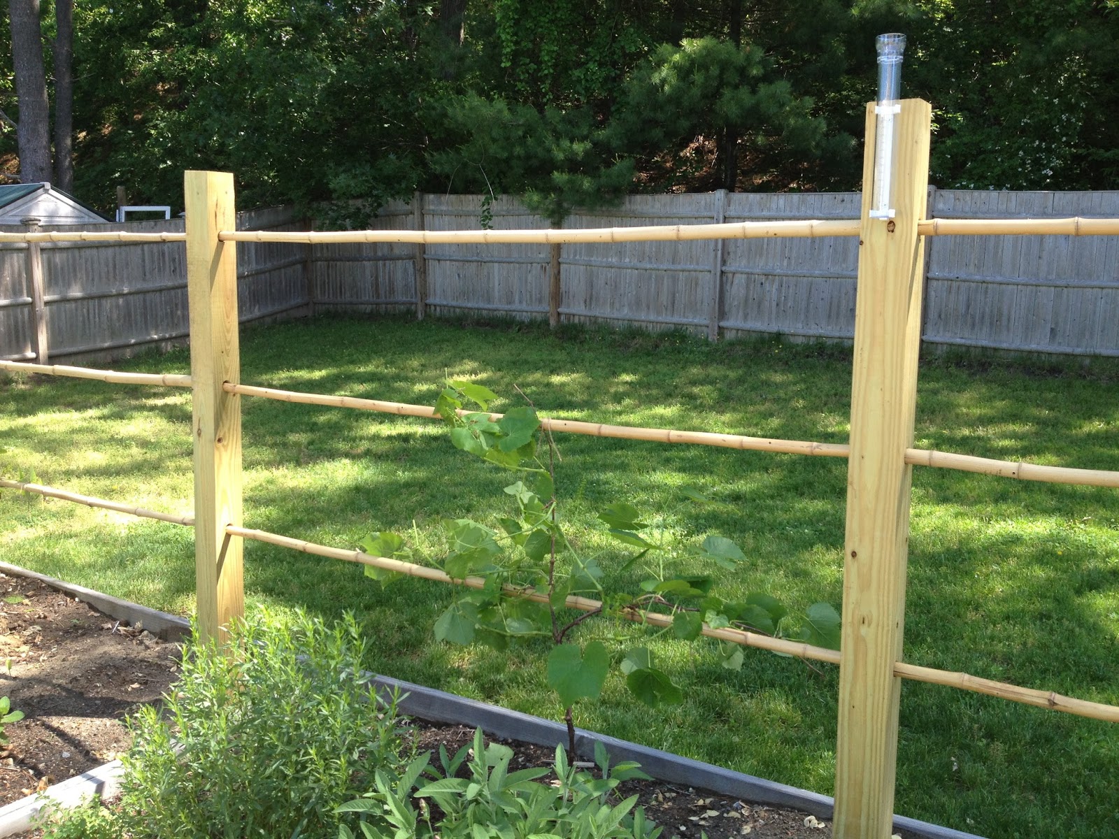 We used beefy bamboo poles for our crosspieces, since we had it leftover from some fencing from the Red House. It's free and should be very sturdy. To insert them, Kirk drilled holes in the posts, then predrilled the bamboo and locked them together with a 3-inch screw. The poles are set 16 inches part from each other.