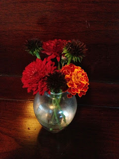 Ok, so there are still not all that many flowers left for cutting, but at least I found a nice new way to photograph them. The vases are set up atop the closed piano keyboard. Also, check out the big daisy that rebloomed — it's the only one to do so in the perennial border, and it's a good one!
