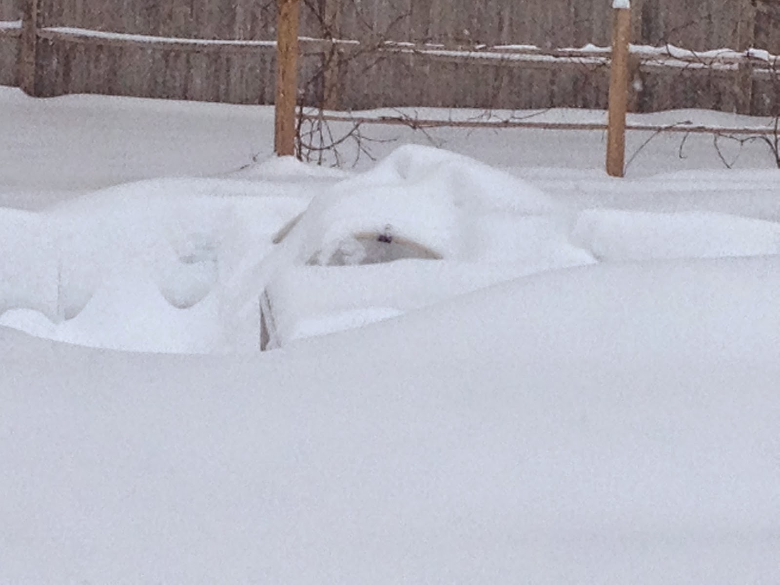 This is a cat's eye view from the kitchen door. That wall of snow is the snow pack over the garden, with a path cleared parallel to the house to take out compost and get to the driveway. It looks like it's about three feet high right now, but this area is well scoured by winds. In other places we have 6-foot drifts.
