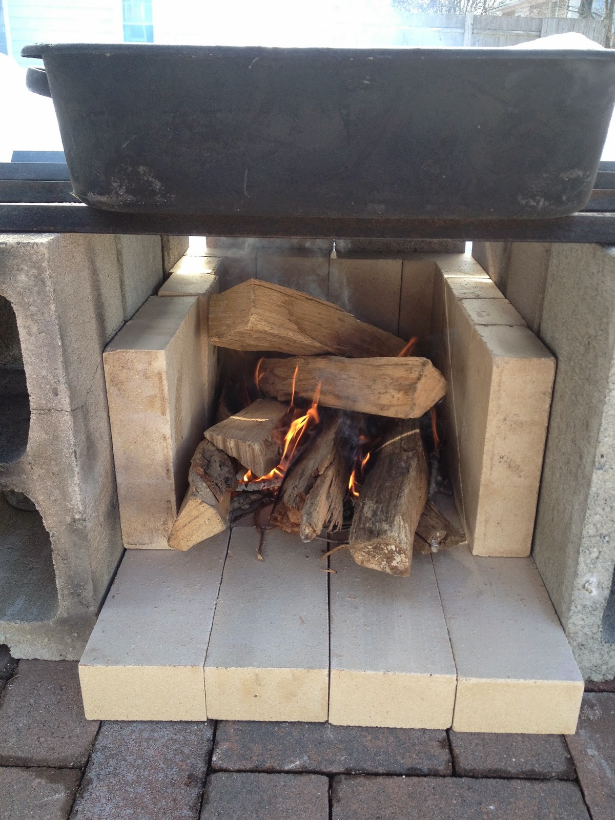 Now the cinderblock box has a fireproof floor to protect the patio and an inner wall to protect the cinderblocks. It makes the area for firewood smaller, but I think it's better insulated, so it produces just as much heat.